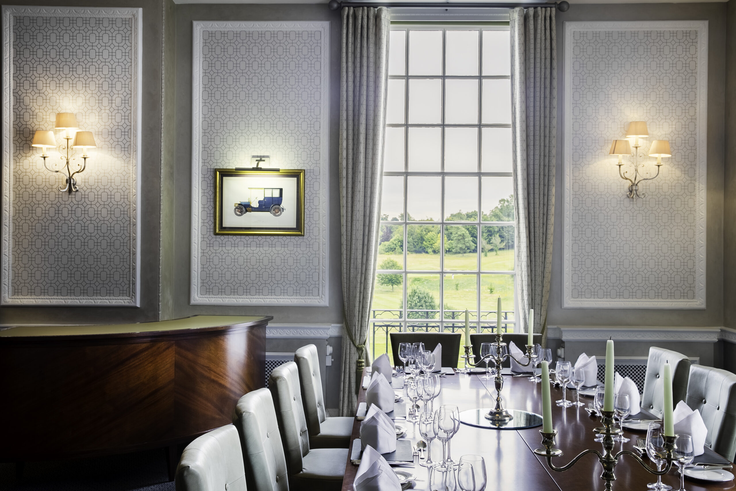 Fine old leather-bound volumes line this classic private dining room, with pleasant views over the estate.